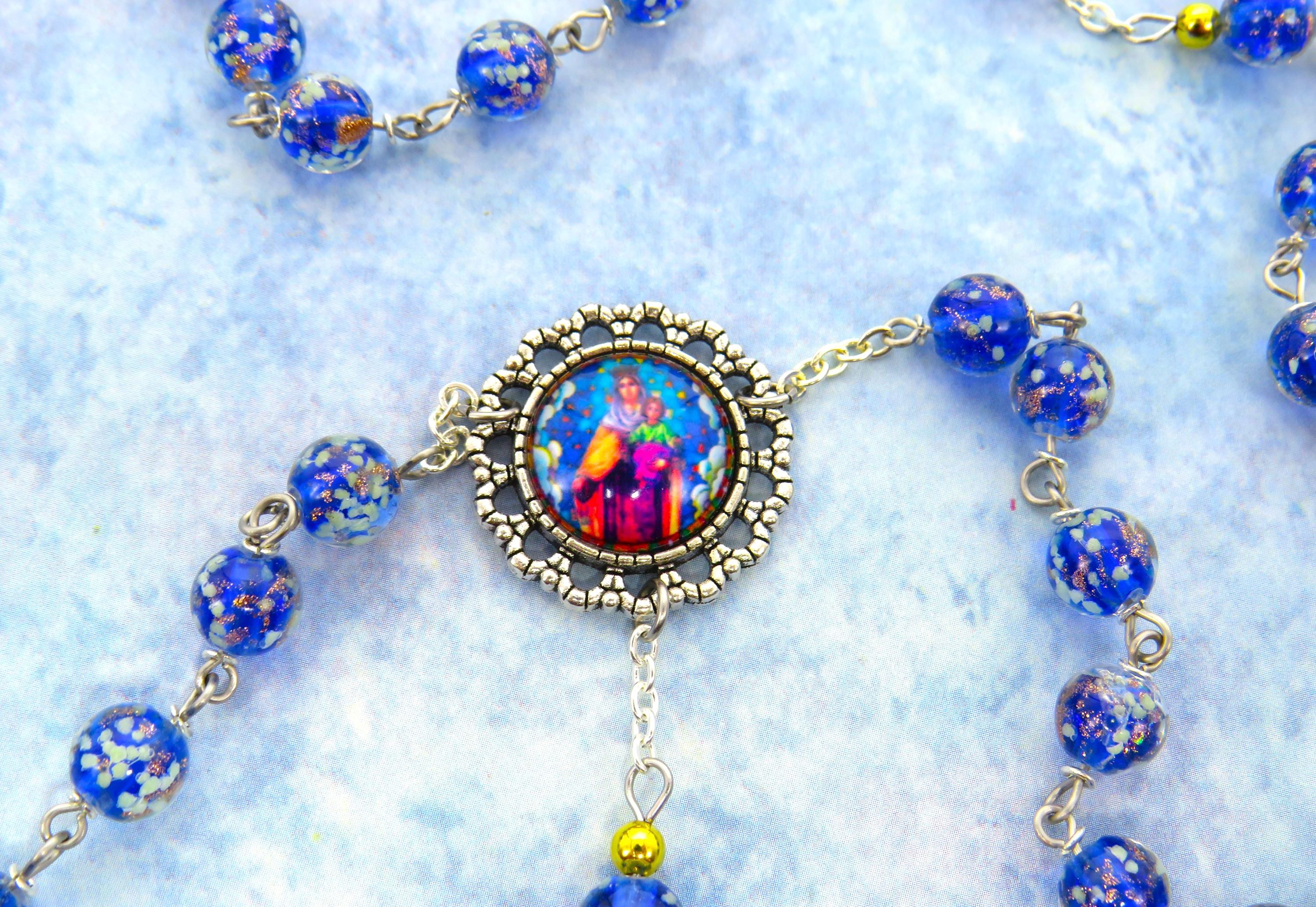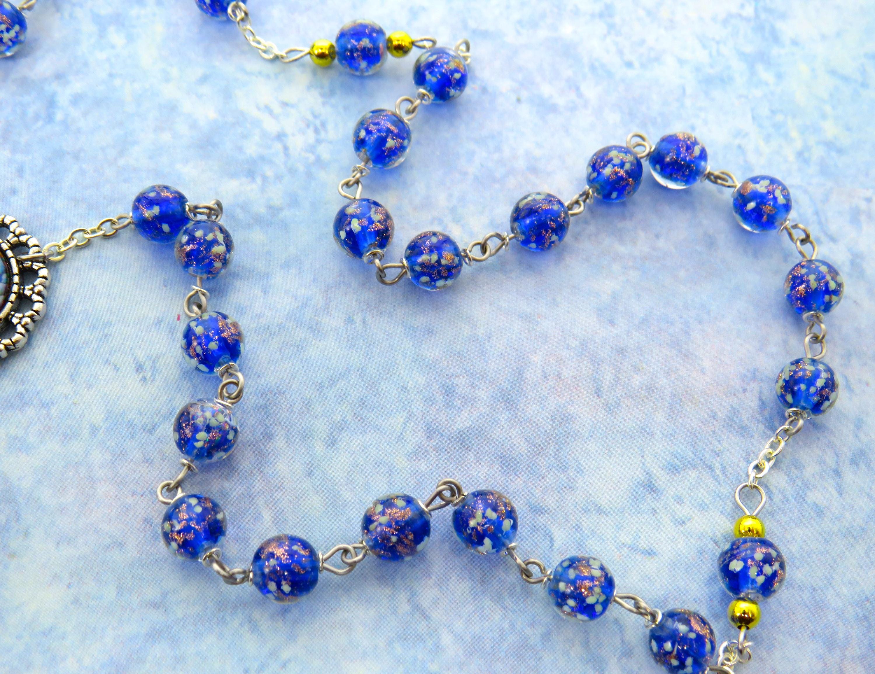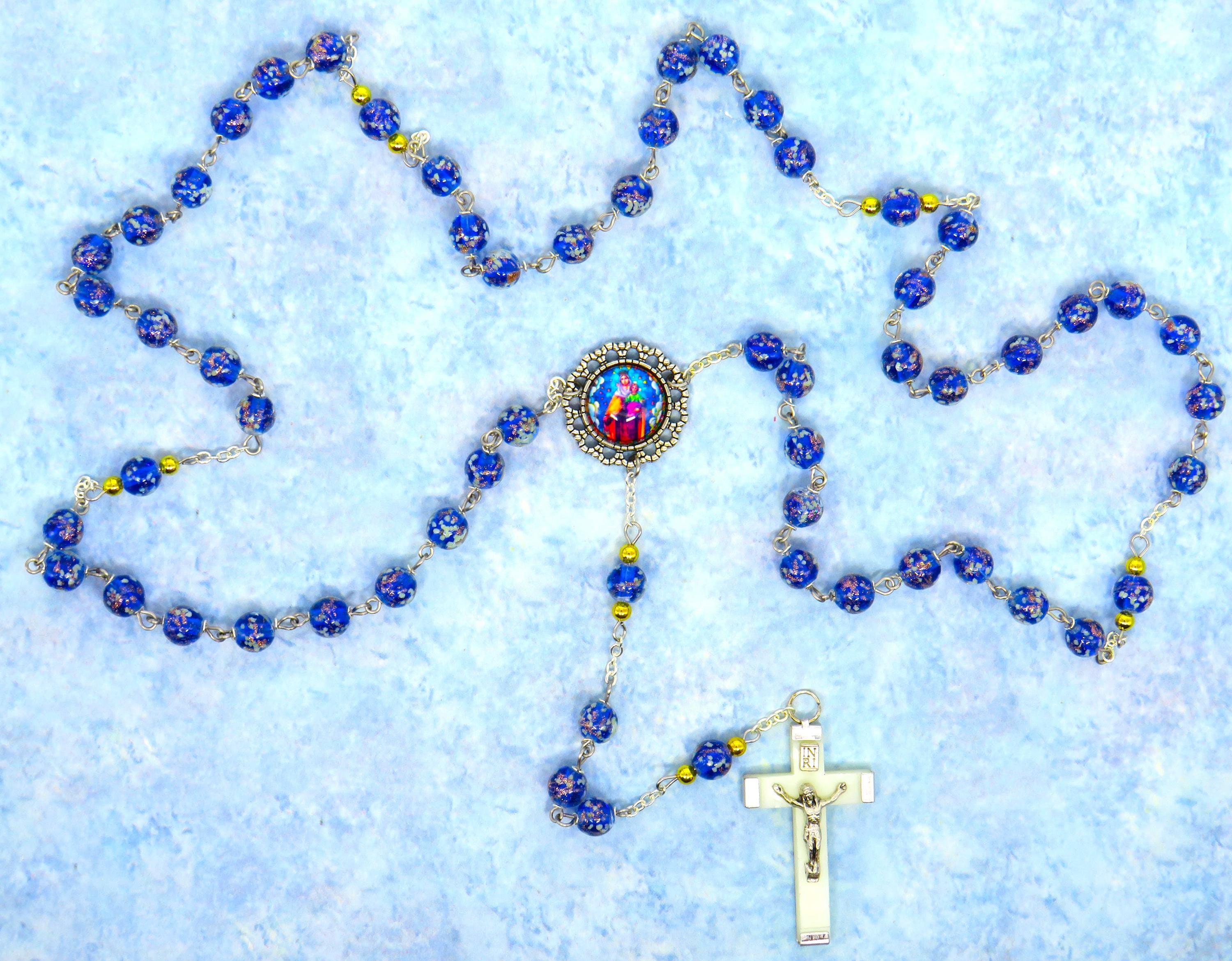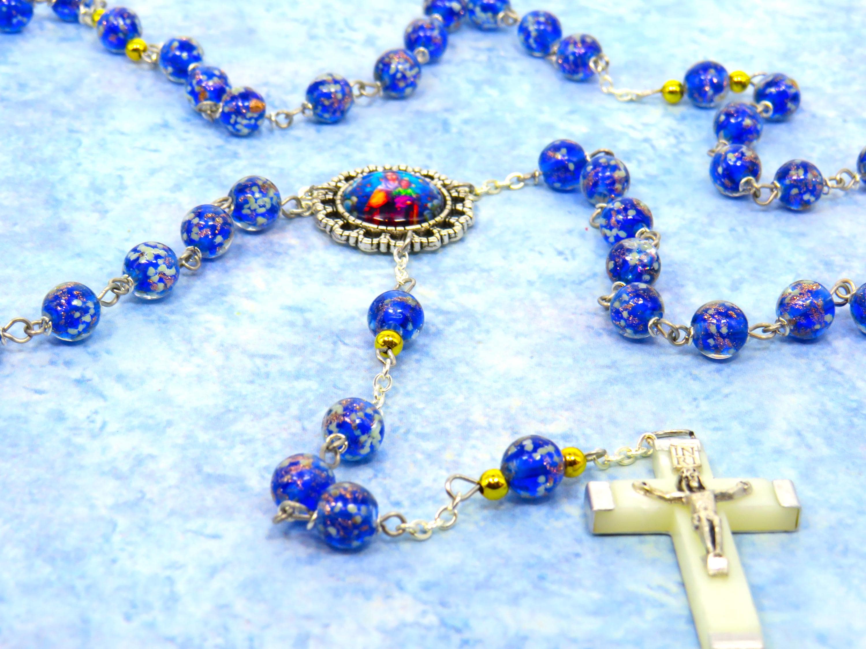 This hand crafted Rosary is absolutely beautiful! I love everything about it- It has Czech Blue, Glow in the dark glass Beads which have Our Lady of Lourdes water filled centers and a luminous Crucifix. I added a St. Michael Medal and Mike sent along a St. Michael prayer card. I’m so happy with this purchase! Thank You!!