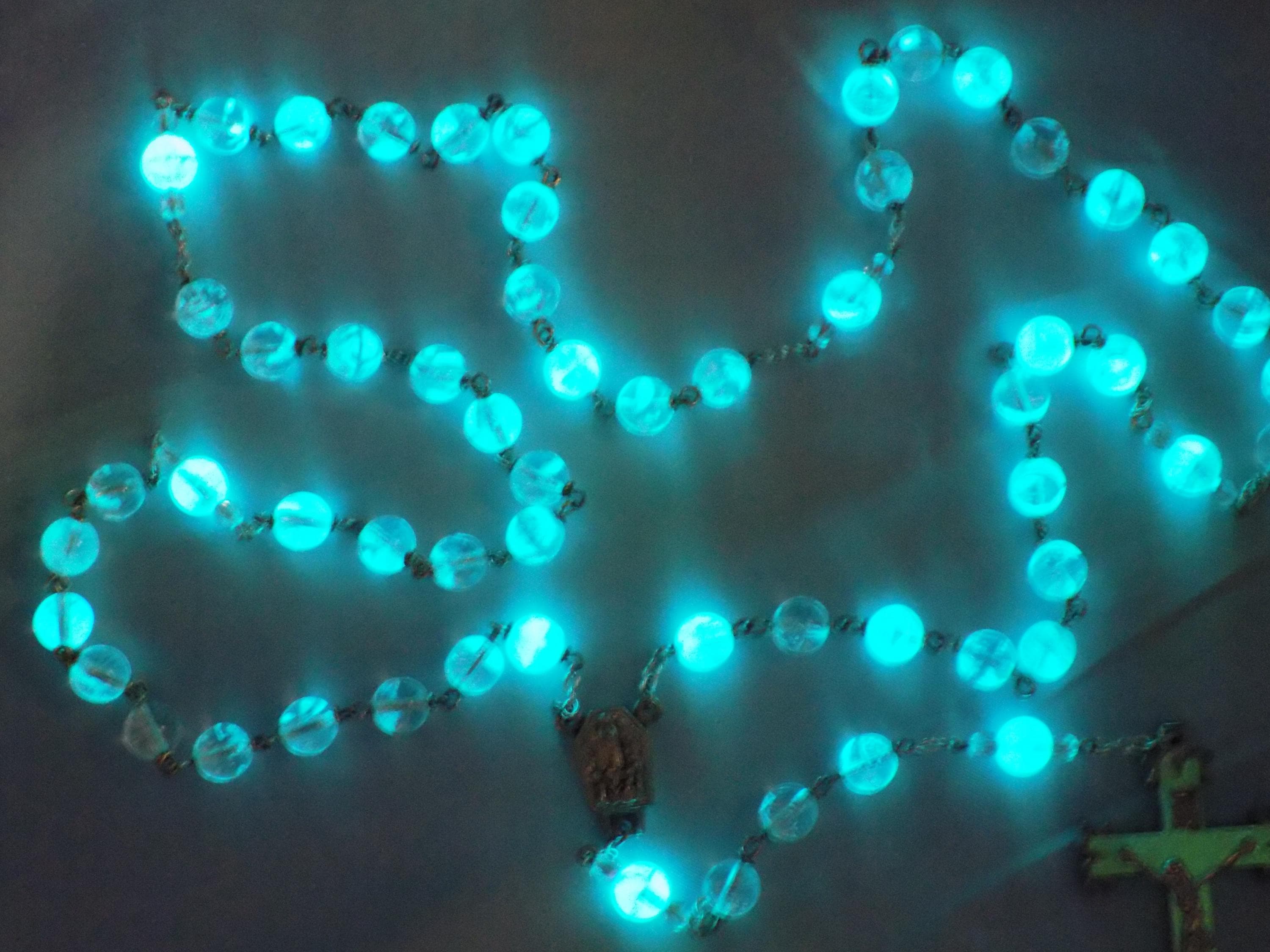 This is a novel take on an old devotion (Rosary!). I really enjoy "charging" it up during the day in a sunny spot and then seeing the lovely glow in the evening. The phosphorescence does generally fade to a very gentle glow after a couple of hours in a darkened room, but that's a good thing because a brightly glowing rosary on my nightstand would definitely keep me awake at night. The rosary seems pretty well made and I like the inclusion of the 2 extra medals. I took off a star because the corpus on the crucifix has a disproportionately large head, so it looks like a child, making it look a little bit strange. But that is a minor thing and doesn't detract from the uniqueness of this devotional item. Overall, I'm happy with this purchase and how fast it arrived.