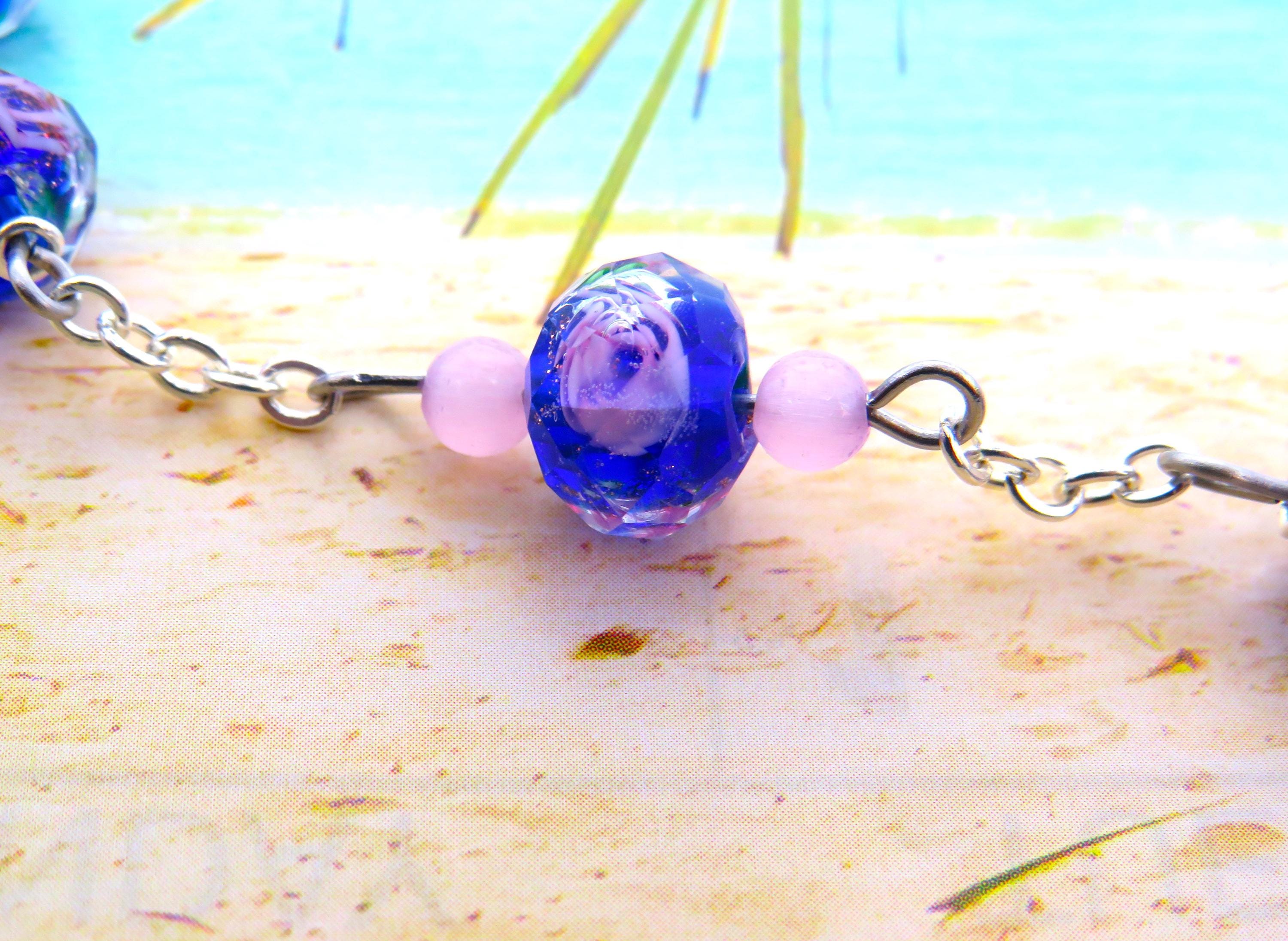 *How Lamp working Glass Beads are Made: In order to make lamp Glass beads, the artist will use a torch to melt narrow rods of glass. The hot molten glass is then wound around a thin length of stainless steel known as a mandrel. The hole in the bead is formed by the space taken up by the mandrel. To form the bead, the mandrel is turned and held in various positions. The shape of the bead is formed through this turning and positioning, as well as with the help from gravity. Tools can also be used during this process to push and pull the glass into proper shape.
