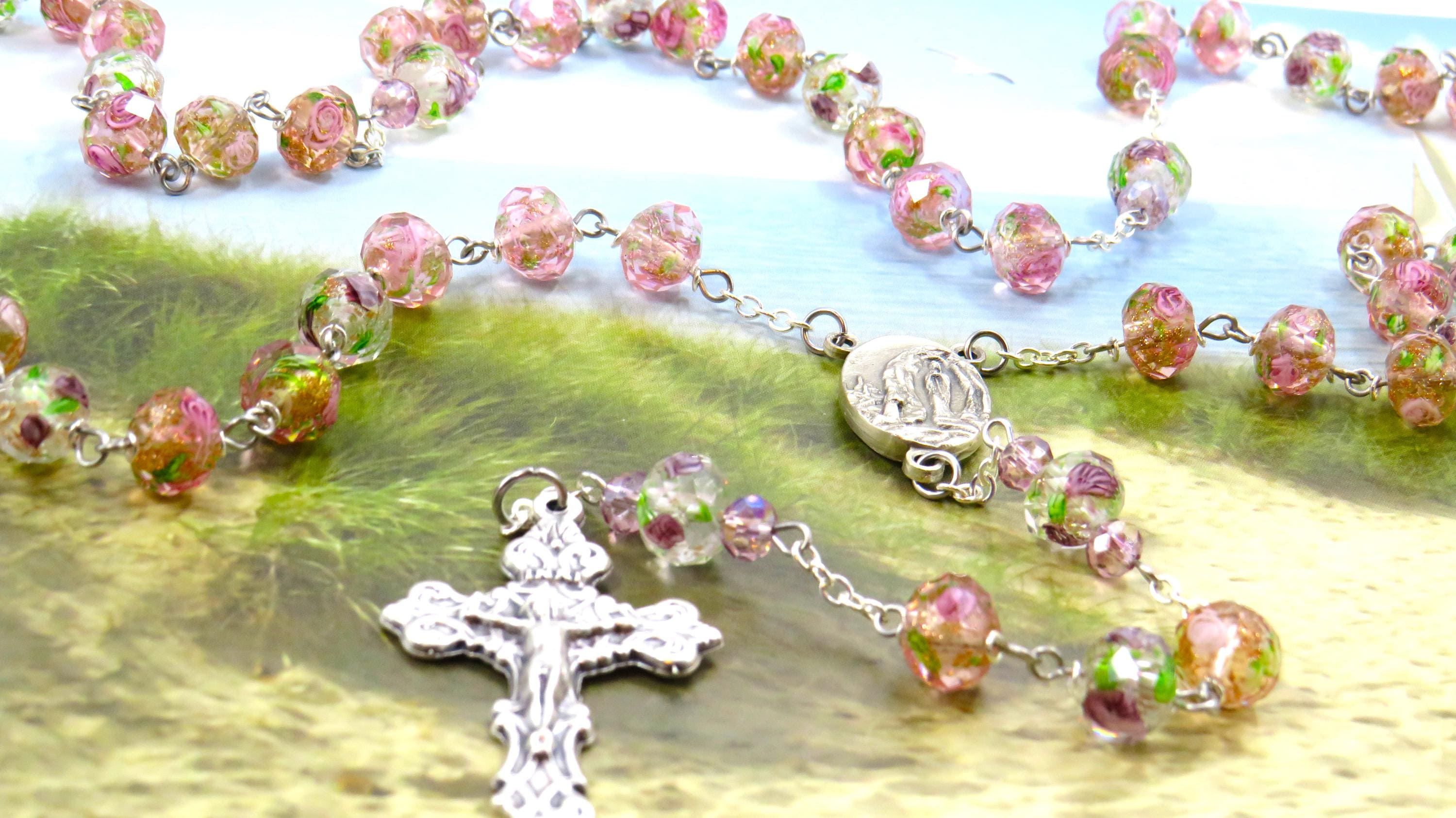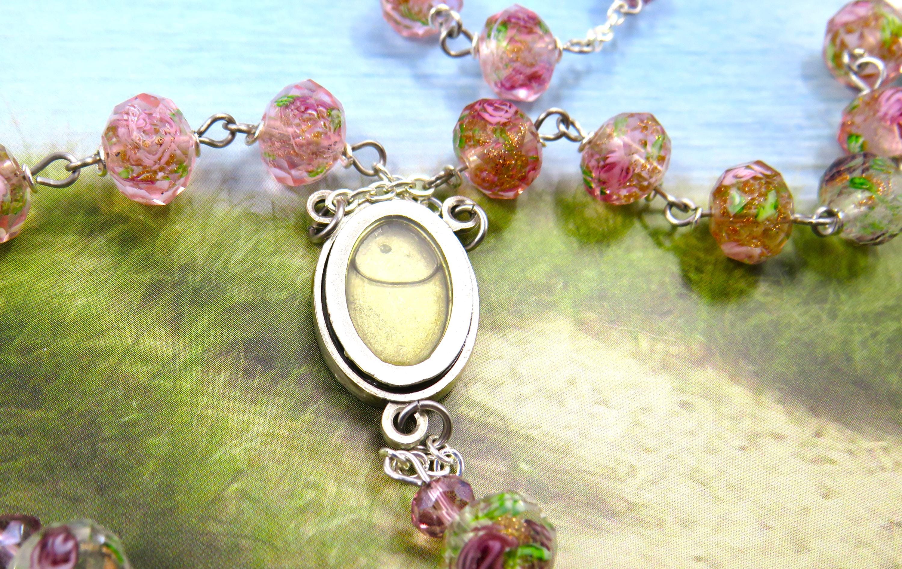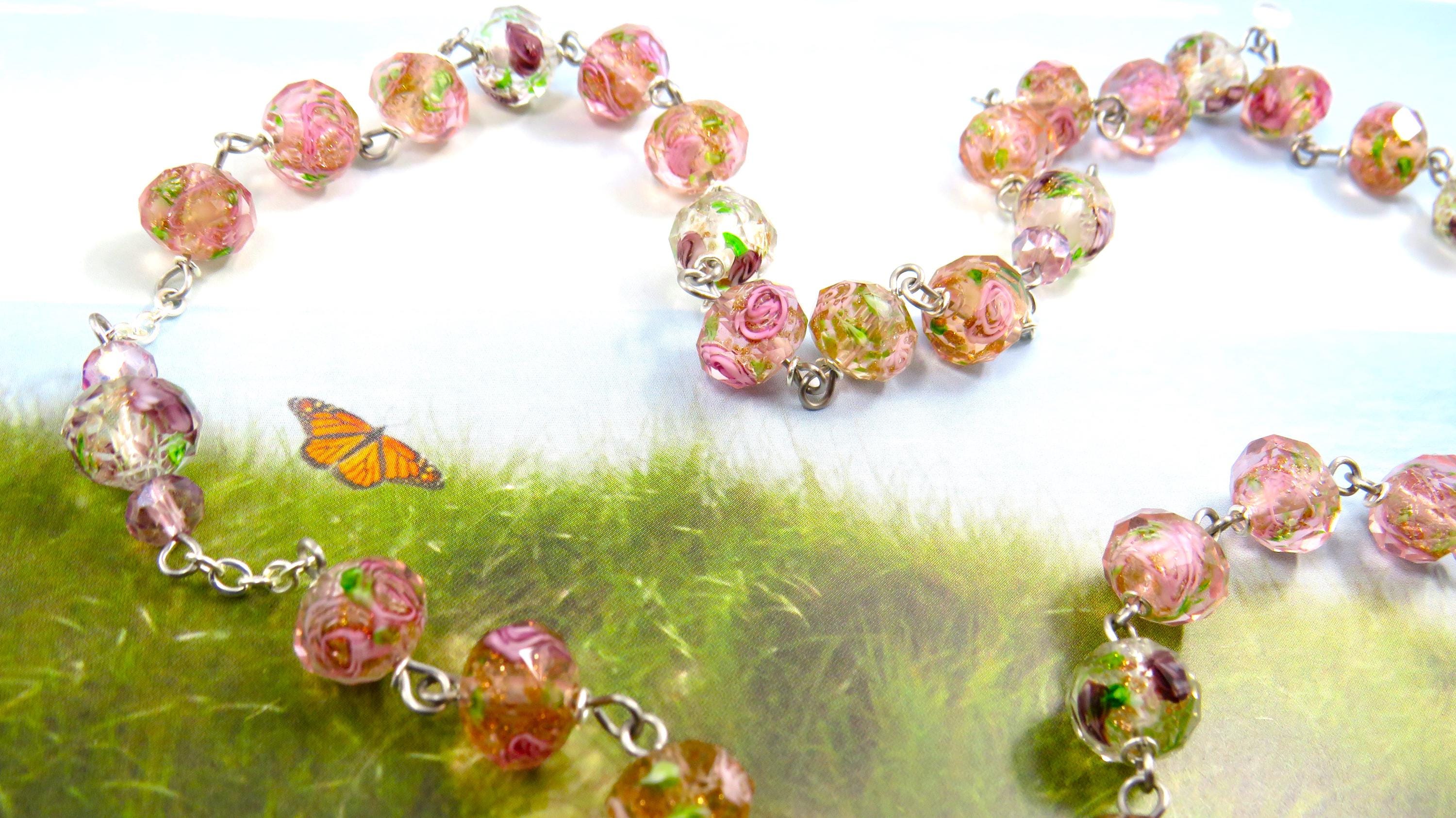 *Pink Rose & Purple Flower Handmade Lamp Glass Rosary