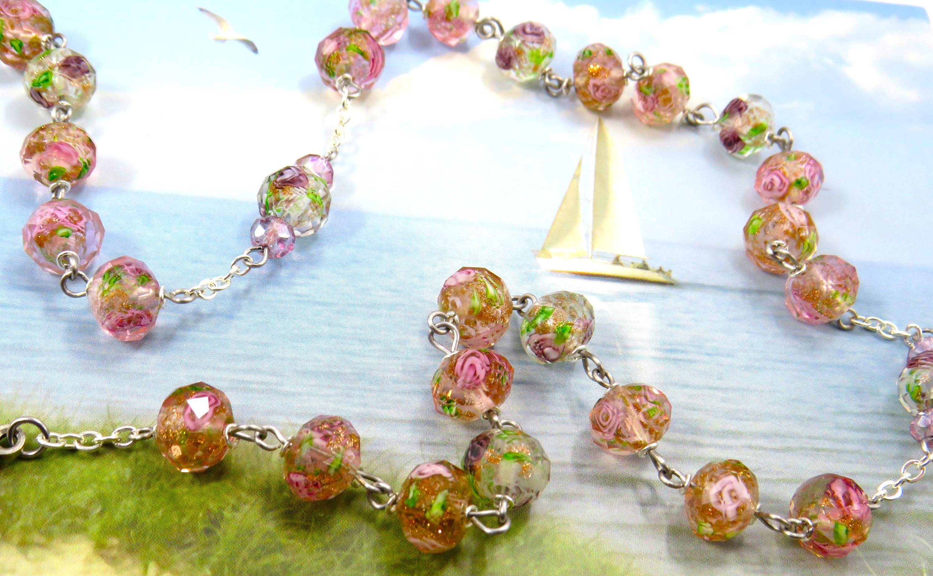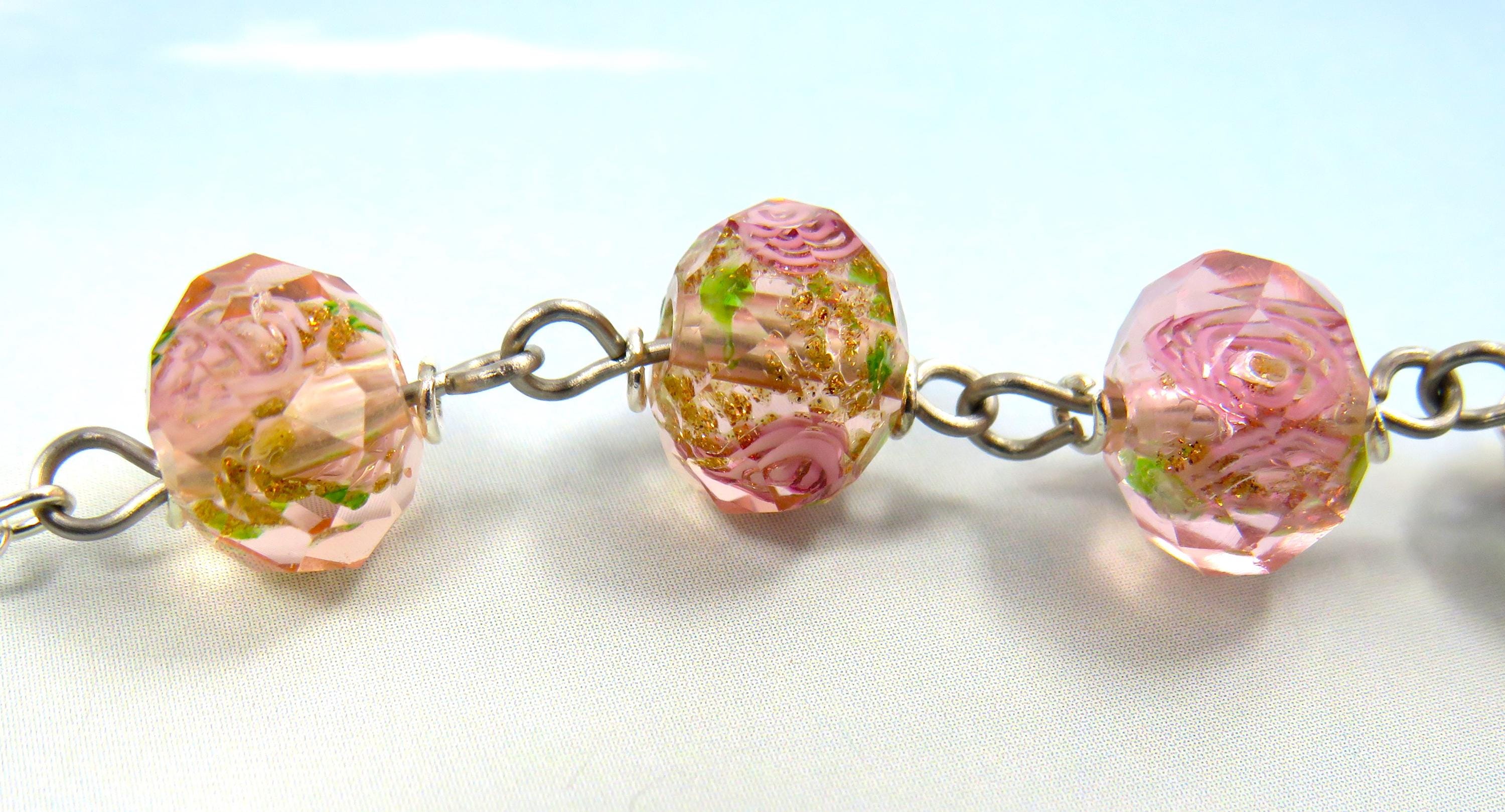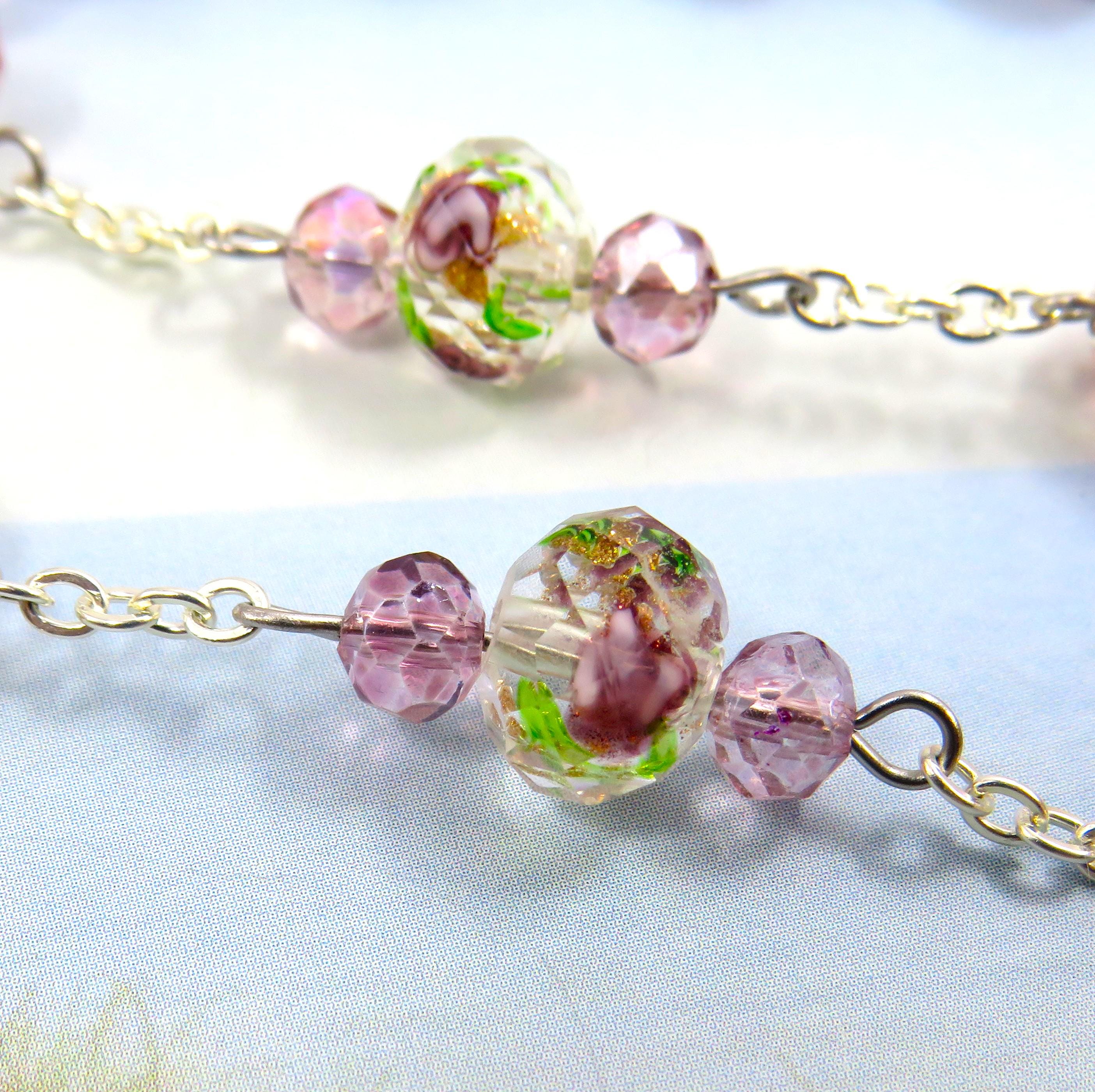 *Pink Rose & Purple Flower Handmade Lamp Glass Rosary