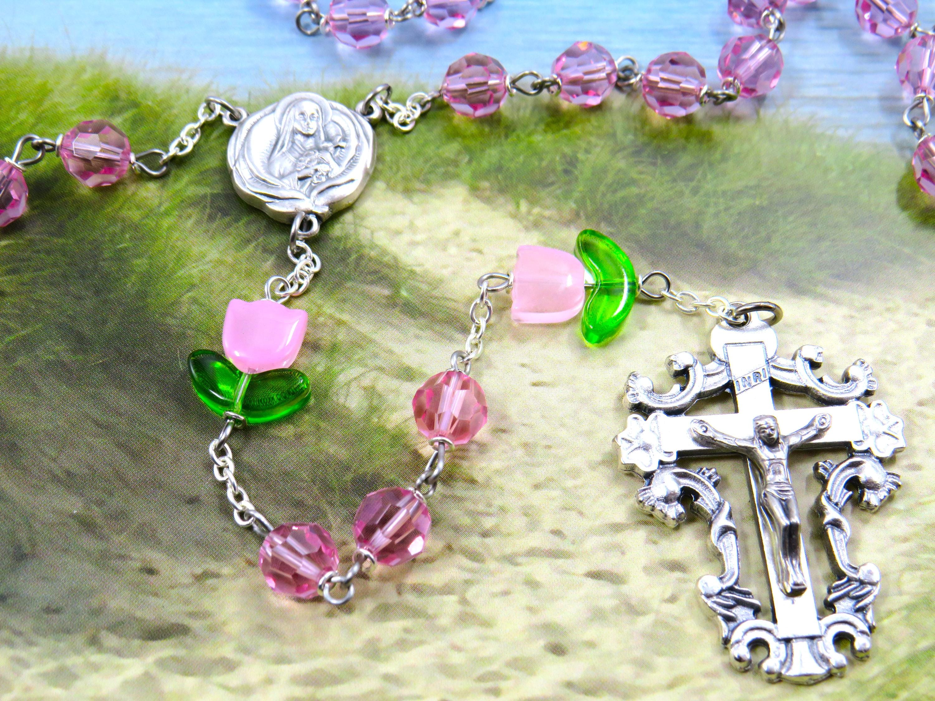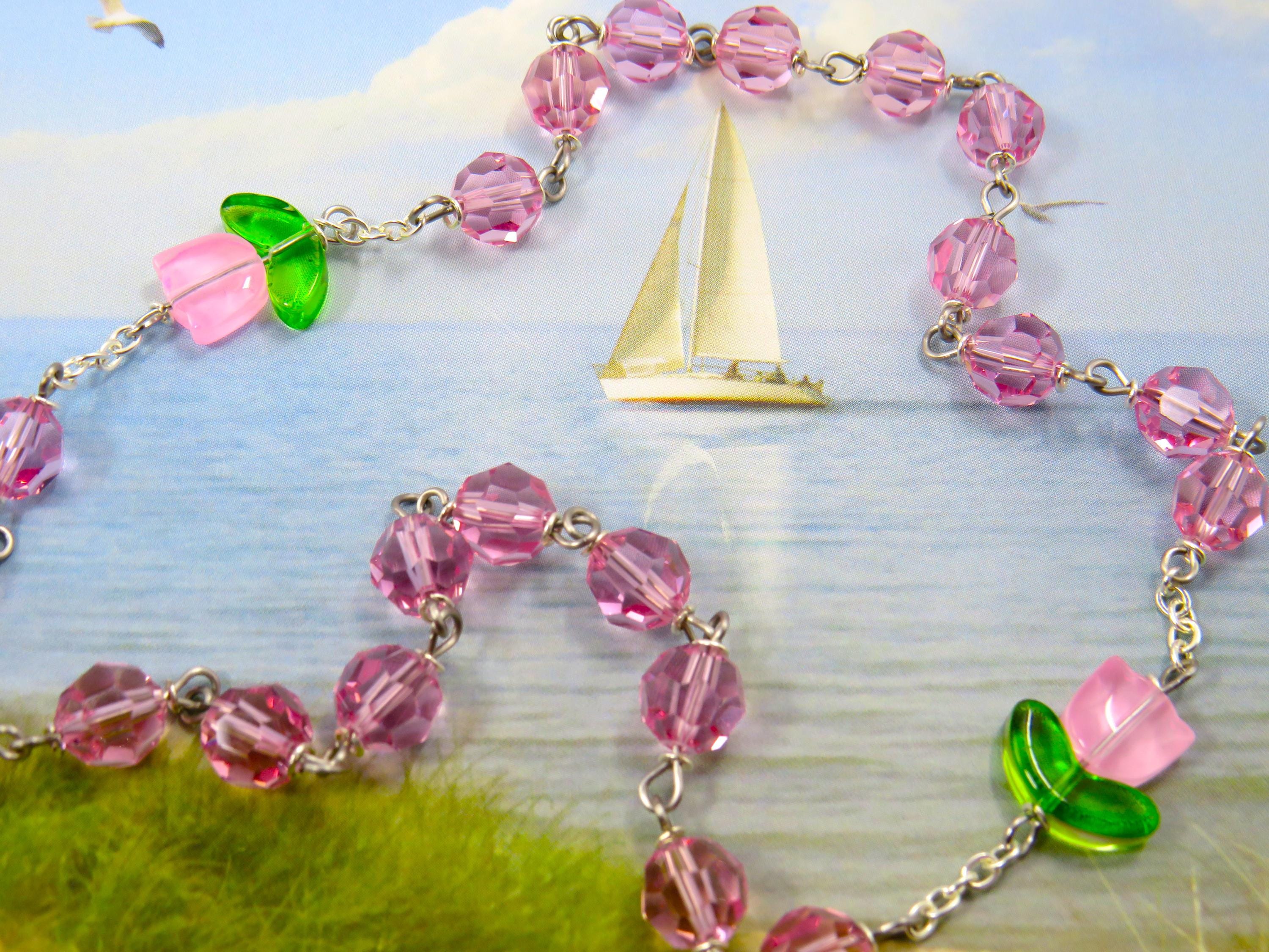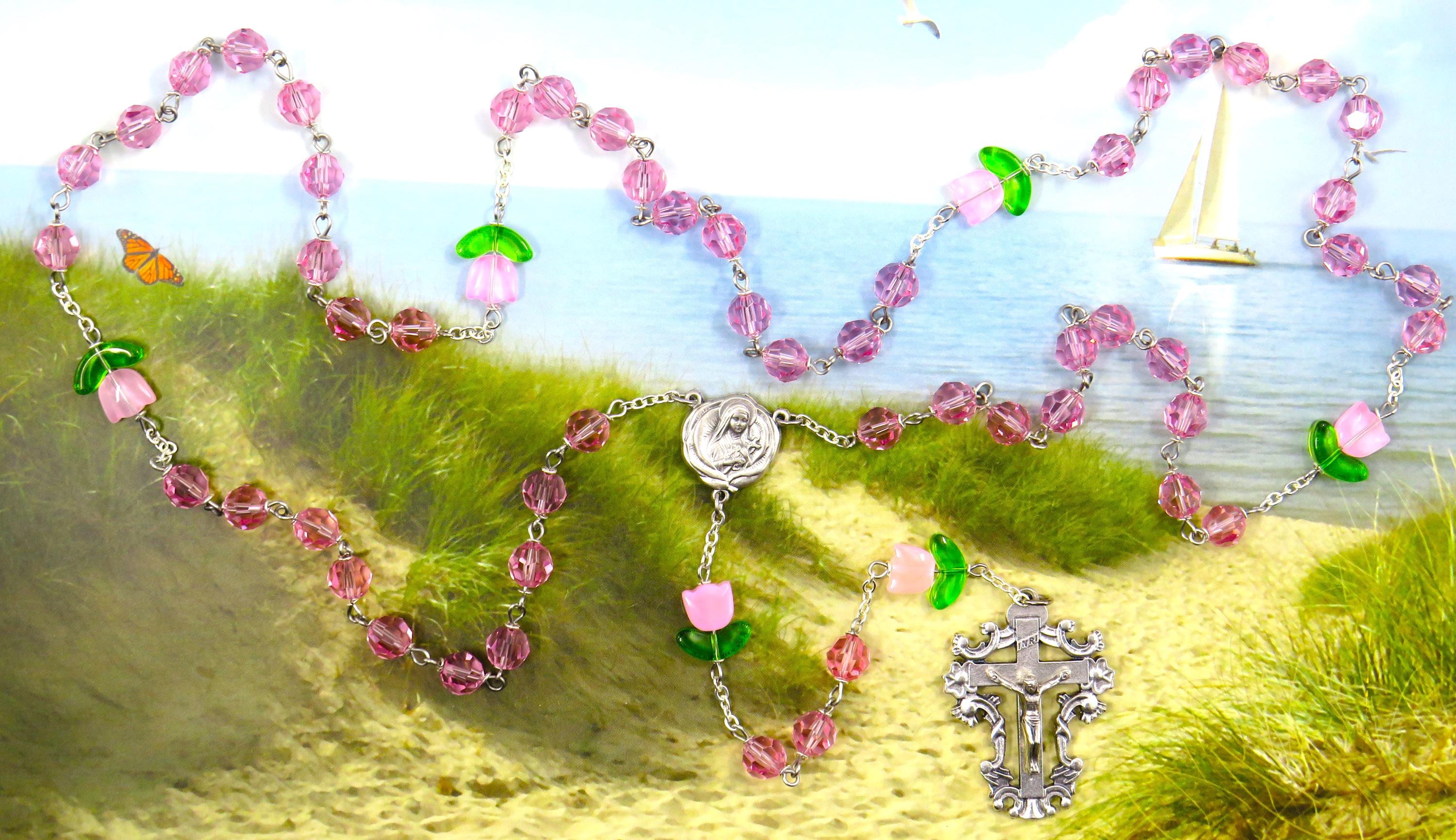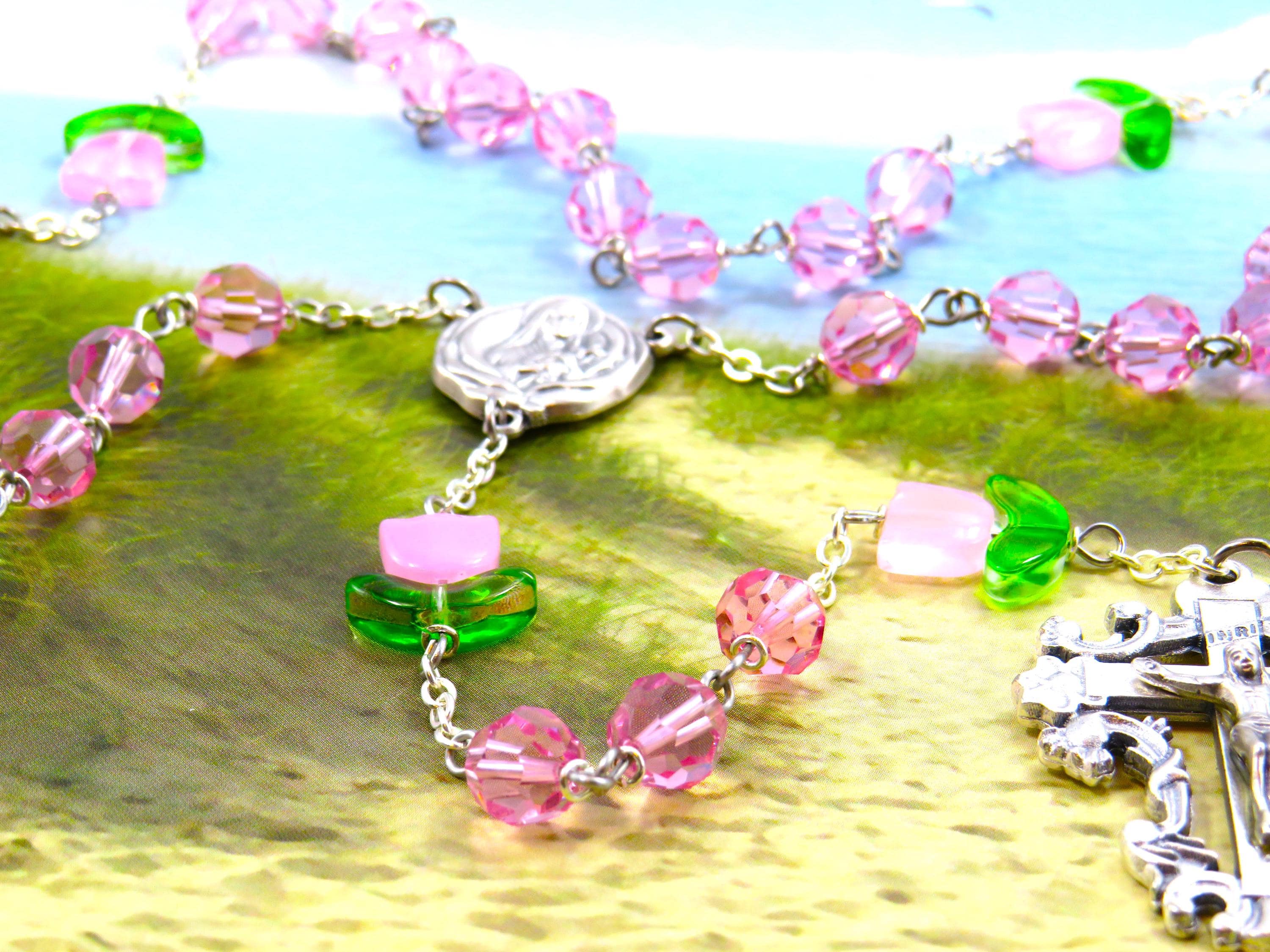*Pink Tulip Flower Swarovski Crystal Rosary