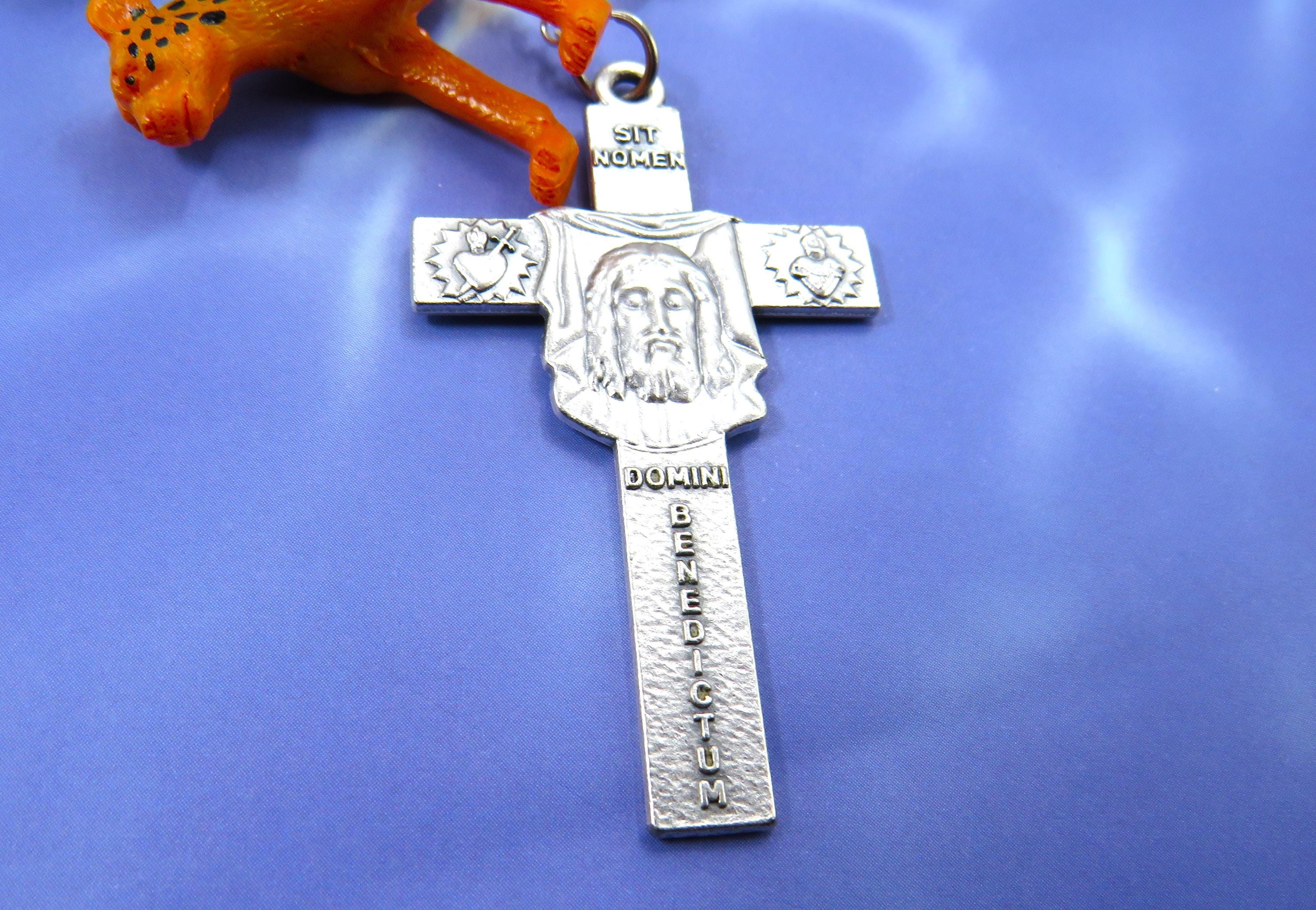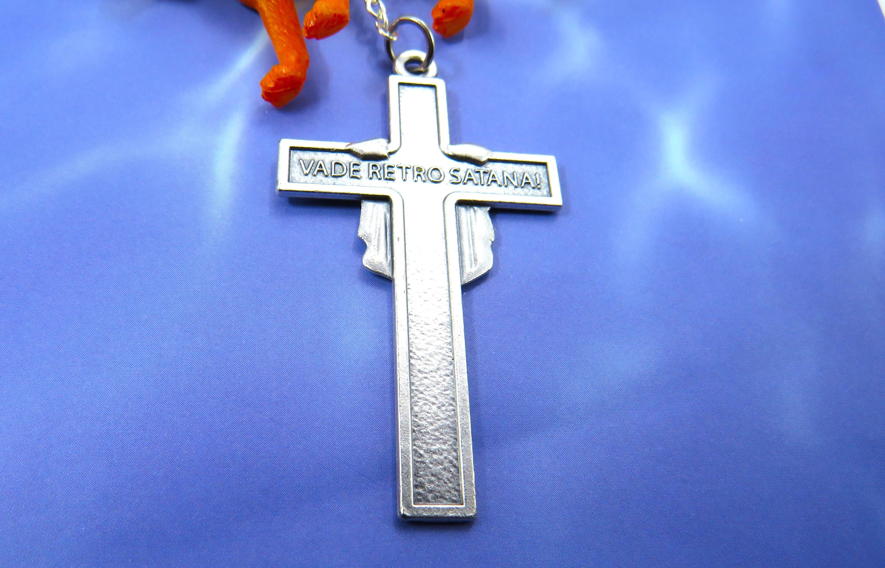 *The Holy Face Crucifix is a unique devotional piece featuring the Shroud of Turin, and at four corners, Sacred Heart of Jesus, Immaculate Heart of Mary and the words "Sit Nomen", "Domini Benedictum" translation: "Blessed be he name of the Lord". On reverse the words "Vade Retro Santana" translation: "Get behind me Satin!"